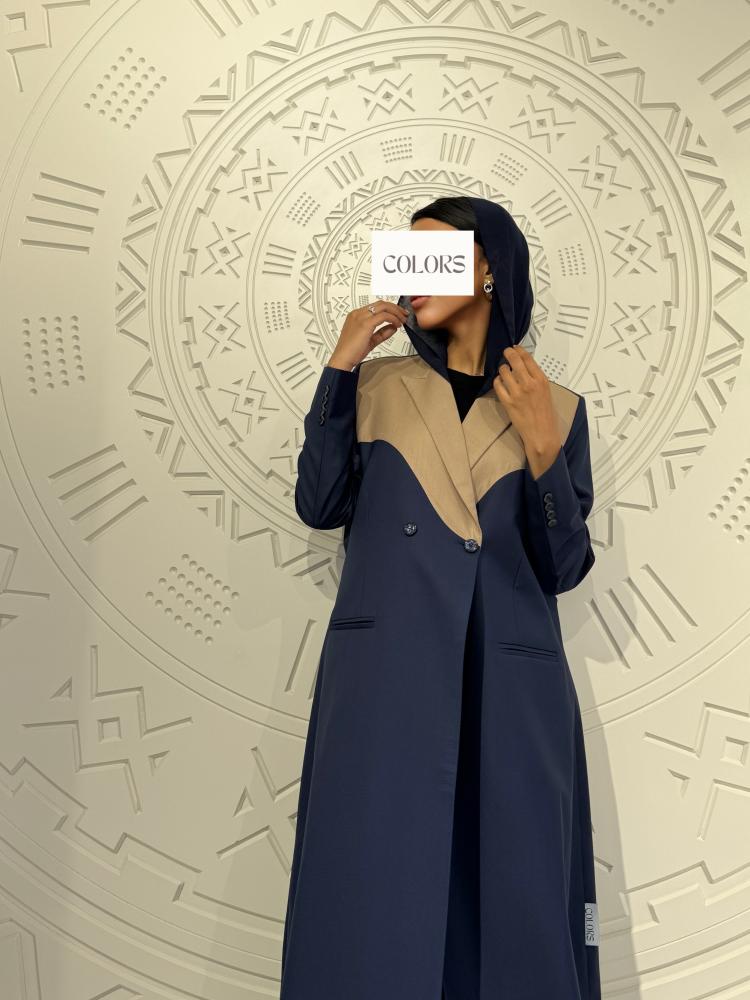 بليزر كتان باللون الكحلي مع تداخلات باللون البيج