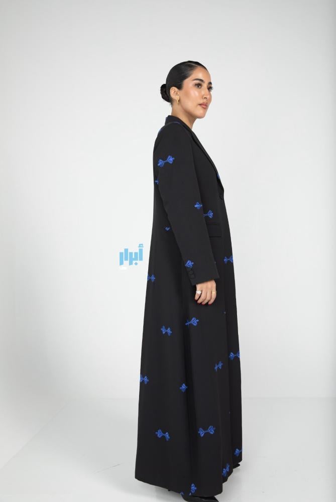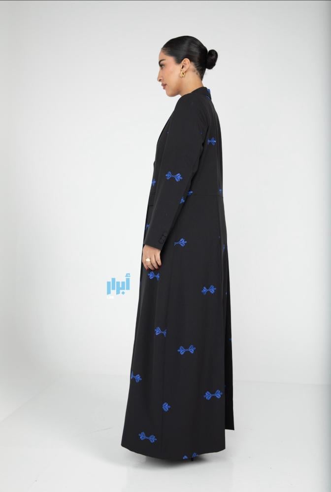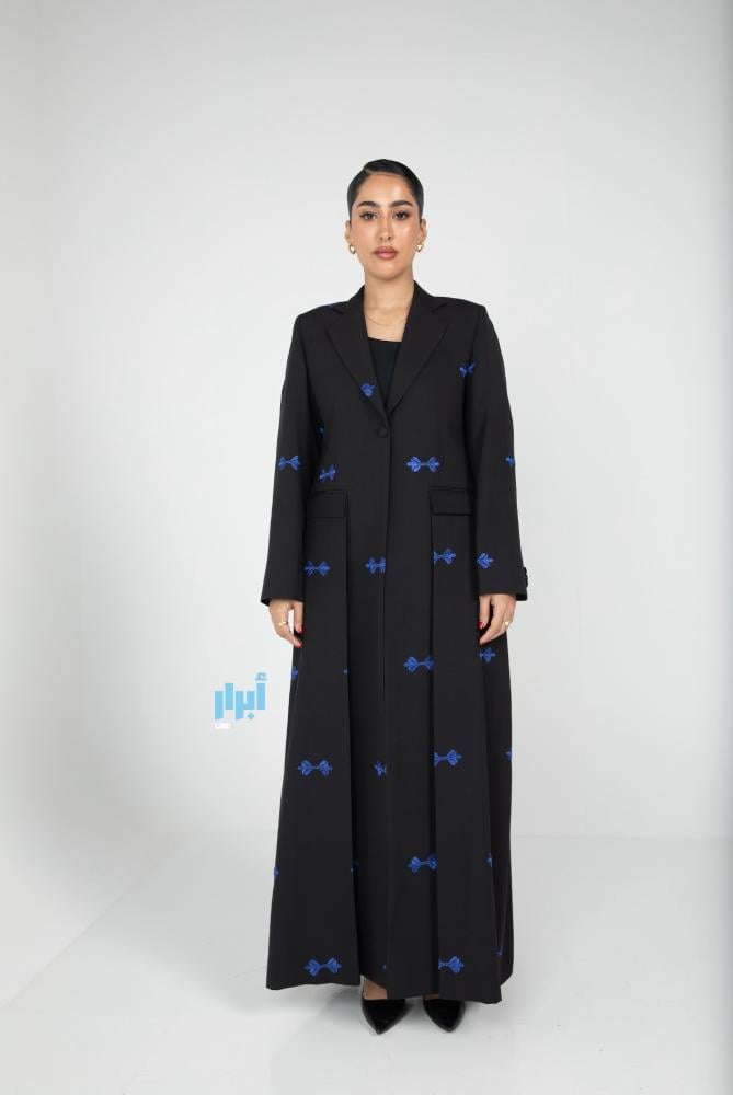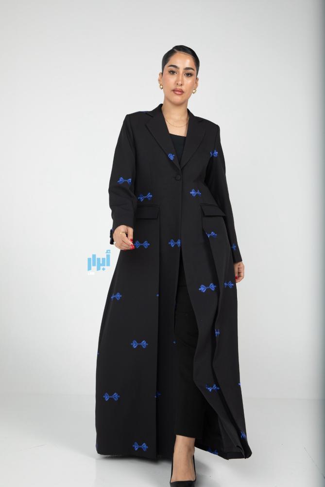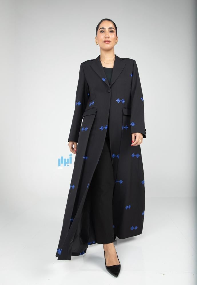 بليزر أسود فاخر مصنوع من الكريب مطرّز بتطريز خاص باللون الأزرق، يضفي لمسة فنية راقية تبرز الذوق الرفيع في كل تفصيلة.