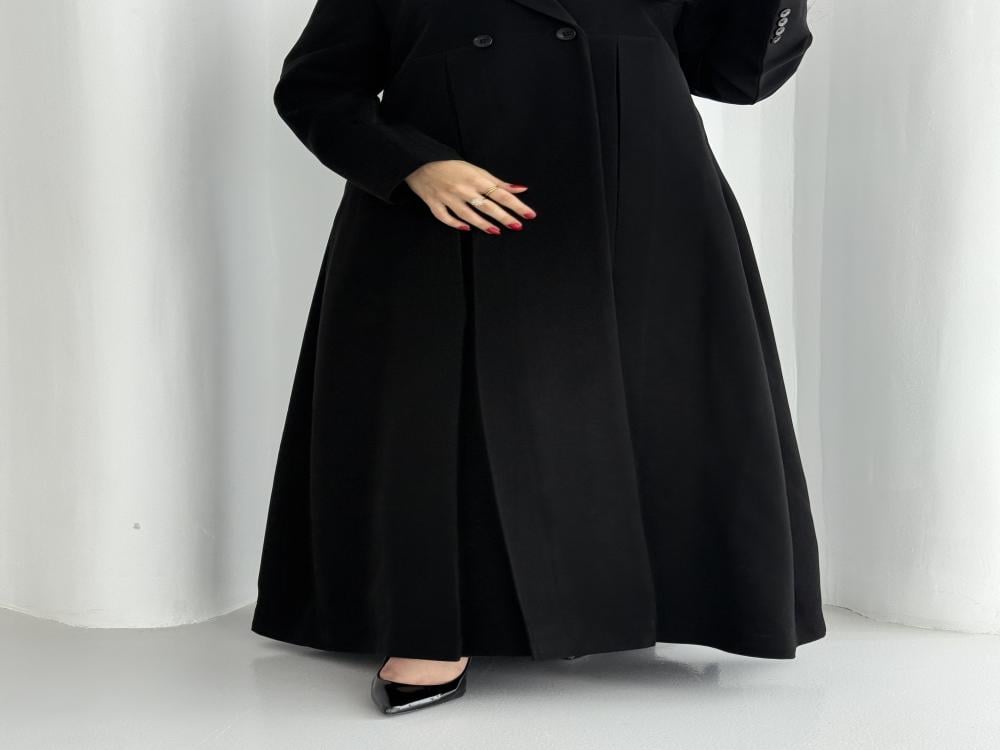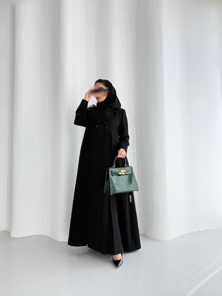 يتميز بتفاصيل كسرات أمامية وخلفية تضيف لمسة هيكلية أنيقة، مع قَصّة A-Line التي تمنحك راحة وانسيابية راقية في كل حركة.