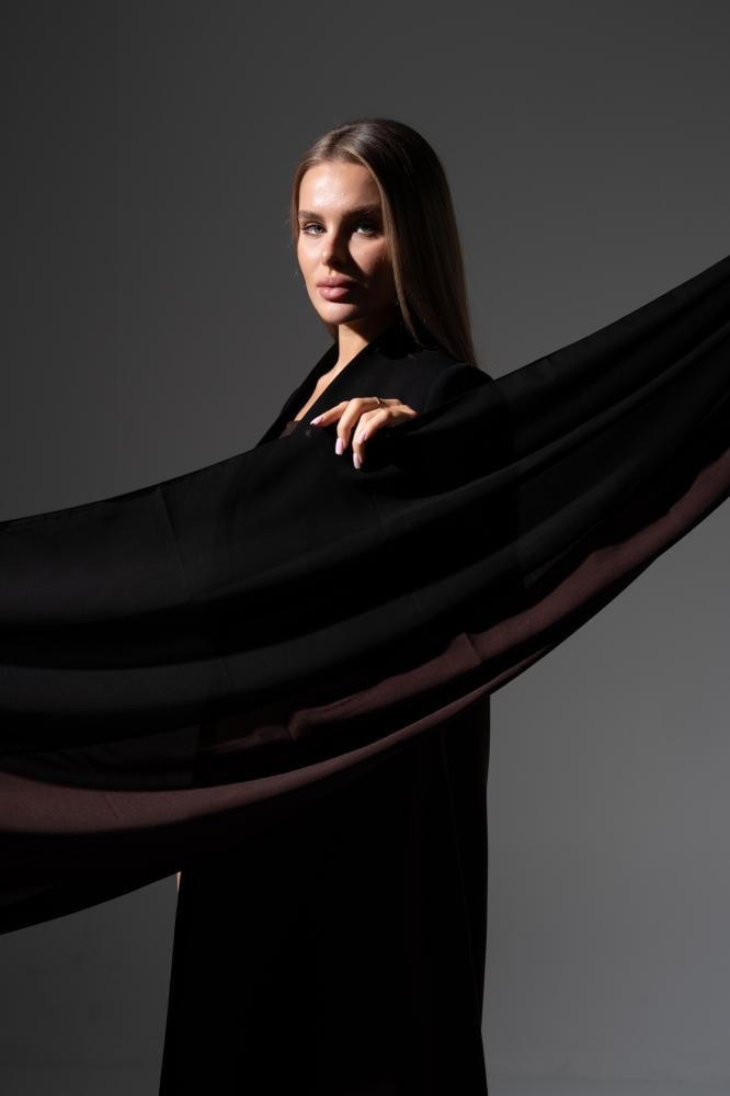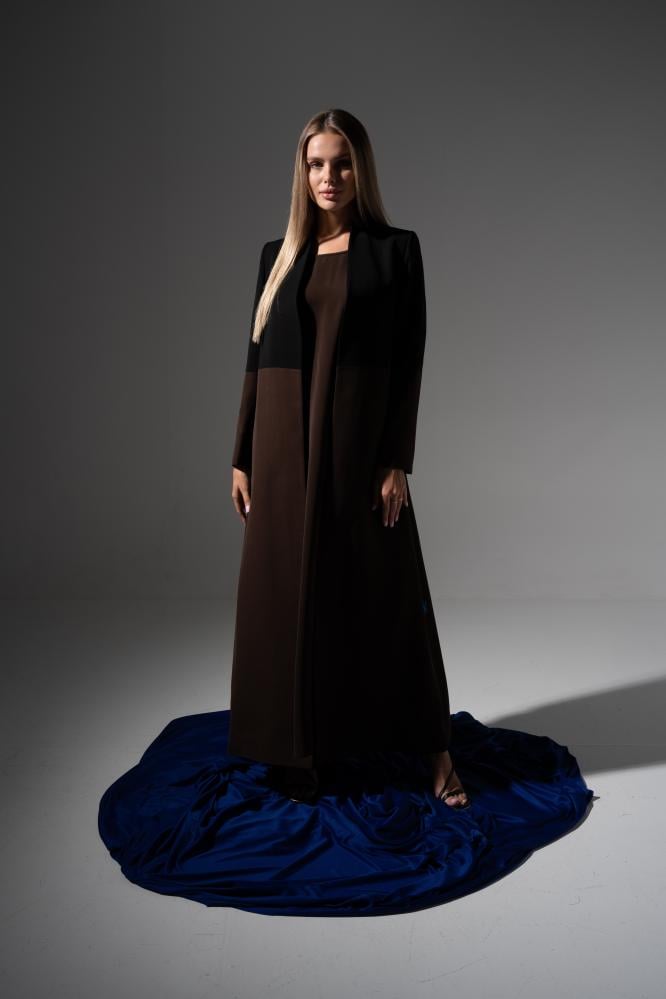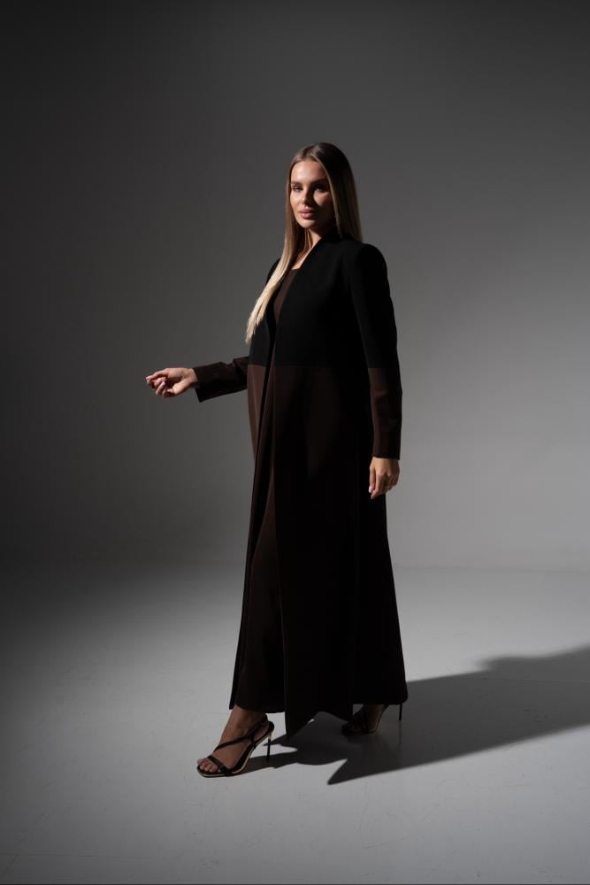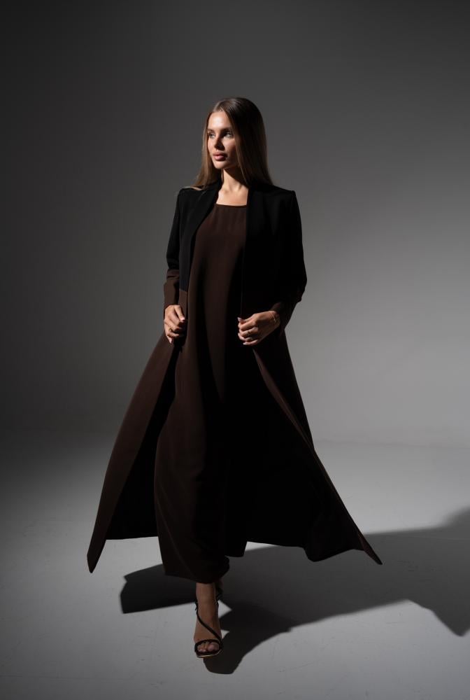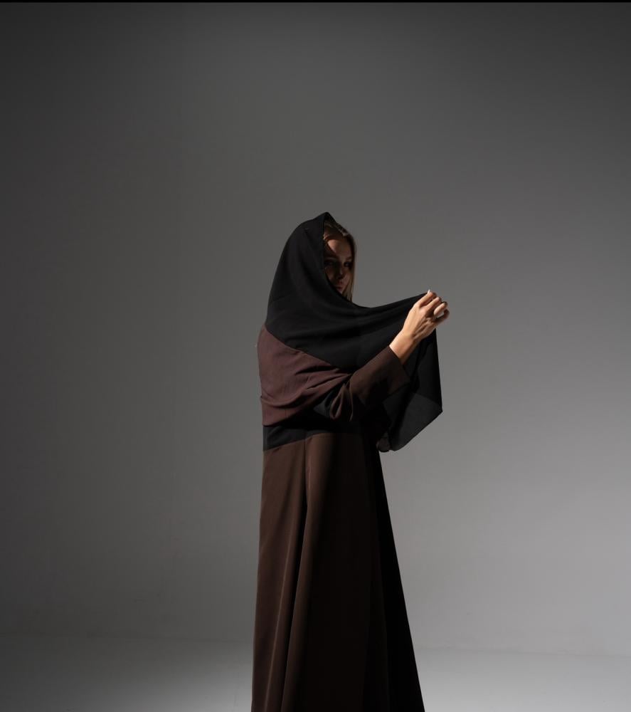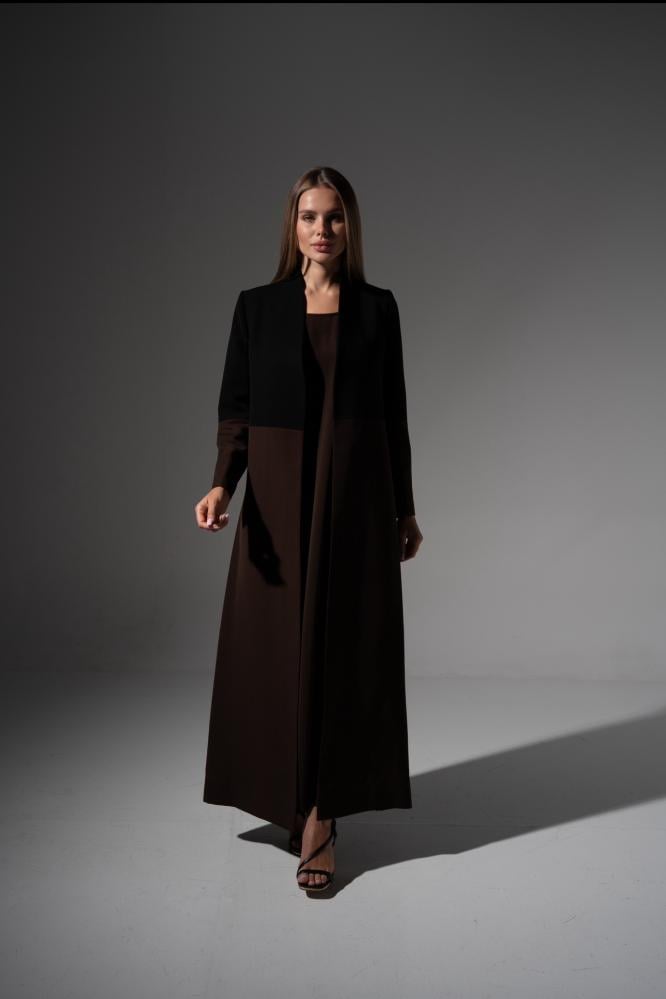 ✨ بليزر أنيق من الكريب بلون بني فاخر بتصميم مميز مع فستان بني بتداخلات باللون الأسود تضيف لمسة راقية ولافتة، مكمل بطرحة أنيقة منسقة بلونين “أسود وبني” لتمنحك إطلالة متكاملة تجمع بين الفخامة والعصرية.
