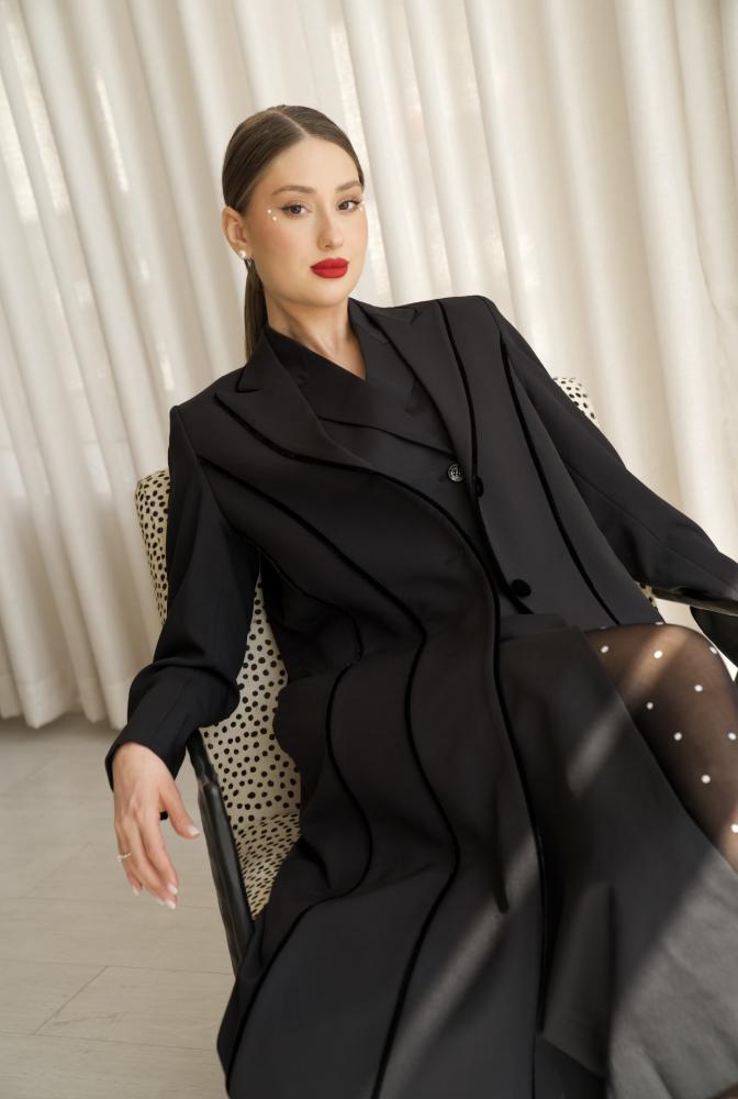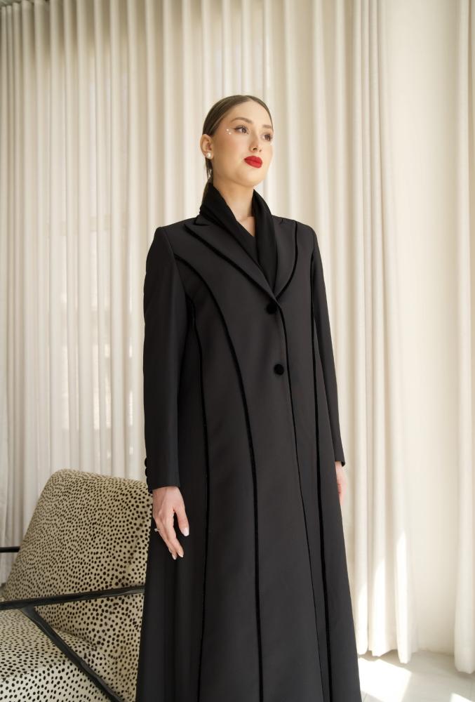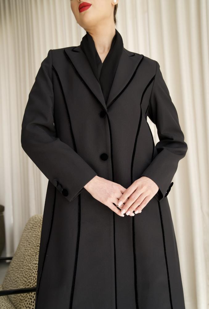 بليزر أنيق باللون الأسود مصنوع من قماش الكريب الفاخر مع تفاصيل مخملية فخمة تضيف لمسة من الفخامة والرقي. يتميز بقصة A-Line التي تمنح إطلالة أنثوية متناسقة وانسيابية.